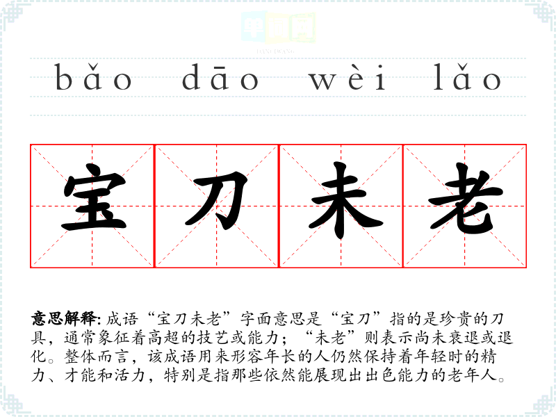 成语“宝刀未老”字面意思是“宝刀”指的是珍贵的刀具,通常象征着高超的技艺或能力;“未老”则表示尚未衰退或退化。整体而言,该成语用来形容年长的人仍然保持着年轻时的精力、才能和活力,特别是指那些依然能展现出出色能力的老年人。