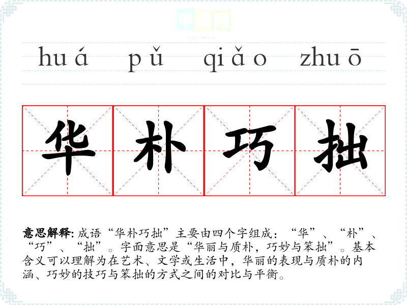 成语“华朴巧拙”主要由四个字组成:“华”、“朴”、“巧”、“拙”。字面意思是“华丽与质朴,巧妙与笨拙”。基本含义可以理解为在艺术、文学或生活中,华丽的表现与质朴的内涵、巧妙的技巧与笨拙的方式之间的对比与平衡。