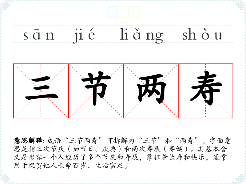 成语“三节两寿”可拆解为“三节”和“两寿”。字面意思是指三次节庆(如节日、庆典)和两次寿辰(寿诞)。其基本含义是形容一个人经历了多个节庆和寿辰,象征着长寿和快乐,通常用于祝贺他人长命百岁,生活富足。