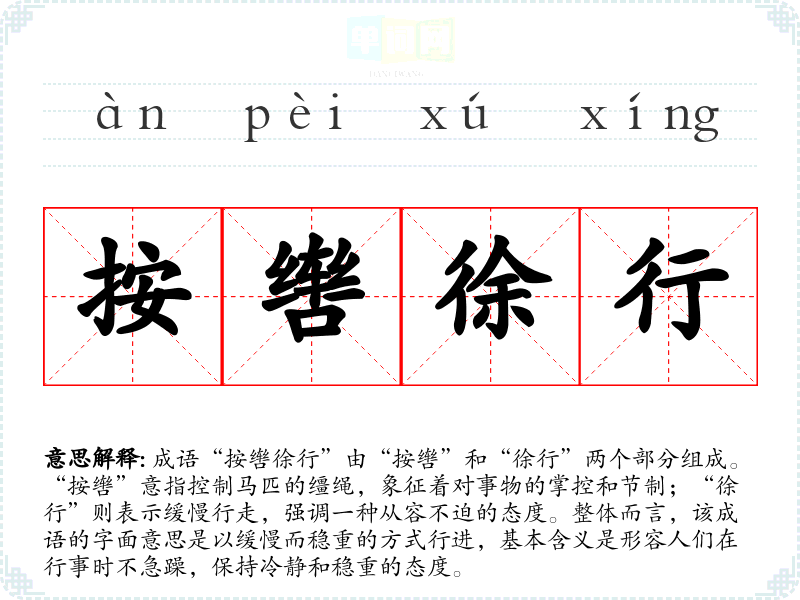 成语“按辔徐行”由“按辔”和“徐行”两个部分组成。“按辔”意指控制马匹的缰绳,象征着对事物的掌控和节制;“徐行”则表示缓慢行走,强调一种从容不迫的态度。整体而言,该成语的字面意思是以缓慢而稳重的方式行进,基本含义是形容人们在行事时不急躁,保持冷静和稳重的态度。