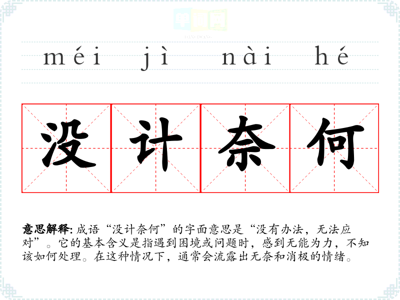 成语“没计奈何”的字面意思是“没有办法,无法应对”。它的基本含义是指遇到困境或问题时,感到无能为力,不知该如何处理。在这种情况下,通常会流露出无奈和消极的情绪。
