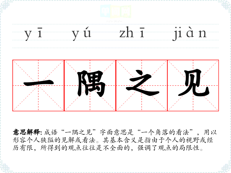 成语“一隅之见”字面意思是“一个角落的看法”,用以形容个人狭隘的见解或看法。其基本含义是指由于个人的视野或经历有限,所得到的观点往往是不全面的,强调了观点的局限性。