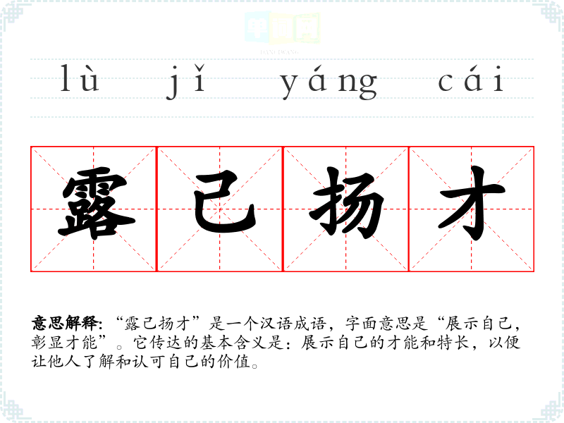 “露己扬才”是一个汉语成语,字面意思是“展示自己,彰显才能”。它传达的基本含义是:展示自己的才能和特长,以便让他人了解和认可自己的价值。