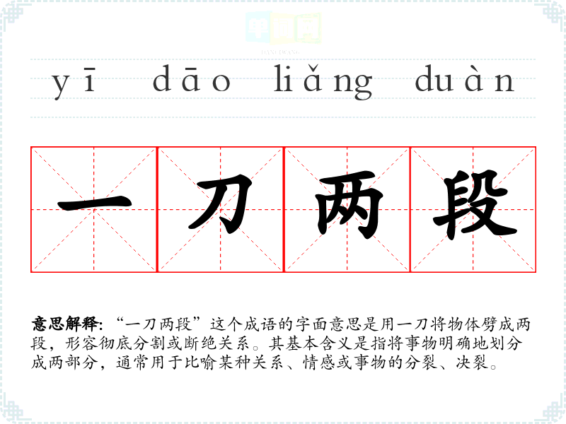 “一刀两段”这个成语的字面意思是用一刀将物体劈成两段,形容彻底分割或断绝关系。其基本含义是指将事物明确地划分成两部分,通常用于比喻某种关系、情感或事物的分裂、决裂。