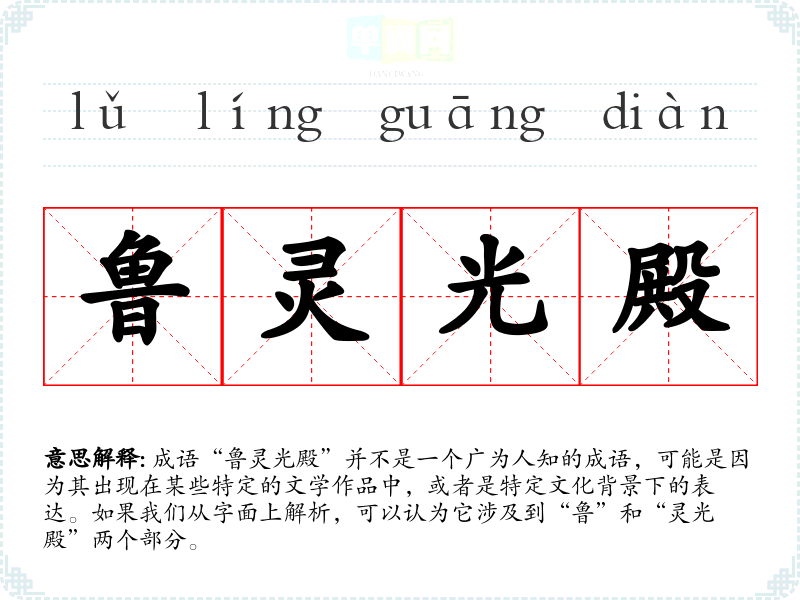 成语“鲁灵光殿”并不是一个广为人知的成语,可能是因为其出现在某些特定的文学作品中,或者是特定文化背景下的表达。如果我们从字面上解析,可以认为它涉及到“鲁”和“灵光殿”两个部分。