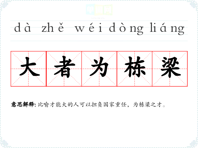 | 大者为栋梁 | 比喻才能大的人可以担负国家重任,为栋梁之才。 |