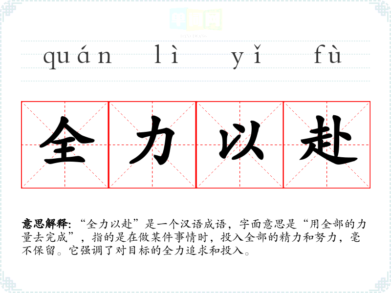 “全力以赴”是一个汉语成语,字面意思是“用全部的力量去完成”,指的是在做某件事情时,投入全部的精力和努力,毫不保留。它强调了对目标的全力追求和投入。