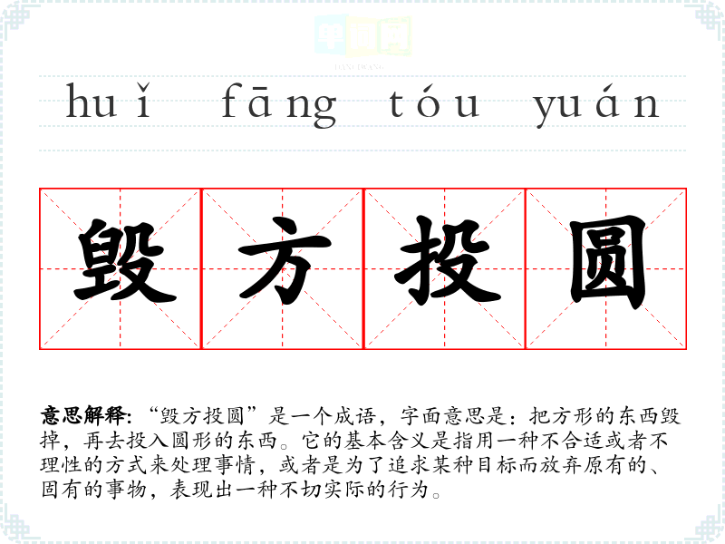 “毁方投圆”是一个成语,字面意思是:把方形的东西毁掉,再去投入圆形的东西。它的基本含义是指用一种不合适或者不理性的方式来处理事情,或者是为了追求某种目标而放弃原有的、固有的事物,表现出一种不切实际的行为。
