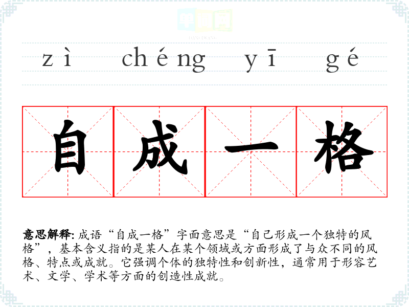 成语“自成一格”字面意思是“自己形成一个独特的风格”,基本含义指的是某人在某个领域或方面形成了与众不同的风格、特点或成就。它强调个体的独特性和创新性,通常用于形容艺术、文学、学术等方面的创造性成就。