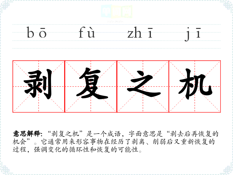 “剥复之机”是一个成语,字面意思是“剥去后再恢复的机会”。它通常用来形容事物在经历了剥离、削弱后又重新恢复的过程,强调变化的循环性和恢复的可能性。