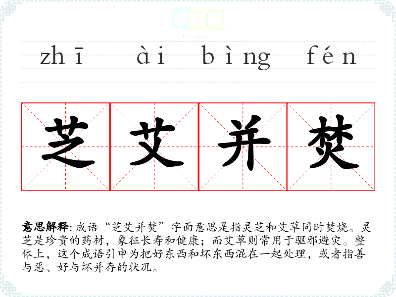 成语“芝艾并焚”字面意思是指灵芝和艾草同时焚烧。灵芝是珍贵的药材,象征长寿和健康;而艾草则常用于驱邪避灾。整体上,这个成语引申为把好东西和坏东西混在一起处理,或者指善与恶、好与坏并存的状况。