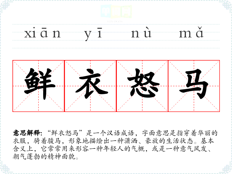 “鲜衣怒马”是一个汉语成语,字面意思是指穿着华丽的衣服,骑着骏马,形象地描绘出一种潇洒、豪放的生活状态。基本含义上,它常常用来形容一种年轻人的气概,或是一种意气风发、朝气蓬勃的精神面貌。