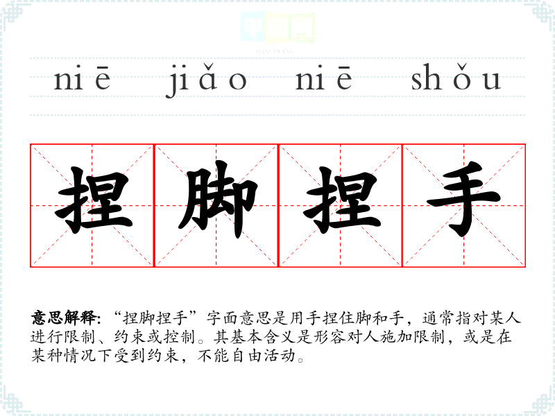 “捏脚捏手”字面意思是用手捏住脚和手,通常指对某人进行限制、约束或控制。其基本含义是形容对人施加限制,或是在某种情况下受到约束,不能自由活动。