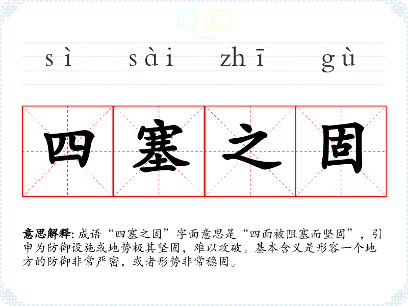成语“四塞之固”字面意思是“四面被阻塞而坚固”,引申为防御设施或地势极其坚固,难以攻破。基本含义是形容一个地方的防御非常严密,或者形势非常稳固。