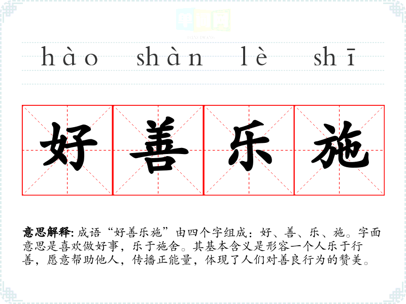 成语“好善乐施”由四个字组成:好、善、乐、施。字面意思是喜欢做好事,乐于施舍。其基本含义是形容一个人乐于行善,愿意帮助他人,传播正能量,体现了人们对善良行为的赞美。