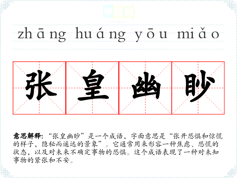 - 同义成语:惶恐不安、心神不宁。这些成语也表达了对未来事物的不安和焦虑,但“张皇幽眇”更强调一种隐秘、遥远的恐惧感。