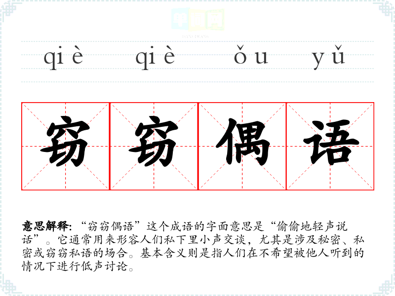 “窃窃偶语”这个成语的字面意思是“偷偷地轻声说话”。它通常用来形容人们私下里小声交谈,尤其是涉及秘密、私密或窃窃私语的场合。基本含义则是指人们在不希望被他人听到的情况下进行低声讨论。