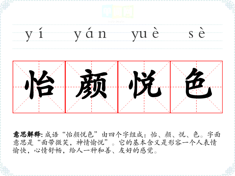 “怡颜悦色”给人一种温暖、和善的感觉,让人联想到亲密的友谊和愉快的交往。它让我意识到,友好的表情可以促进沟通,拉近人与人之间的距离。