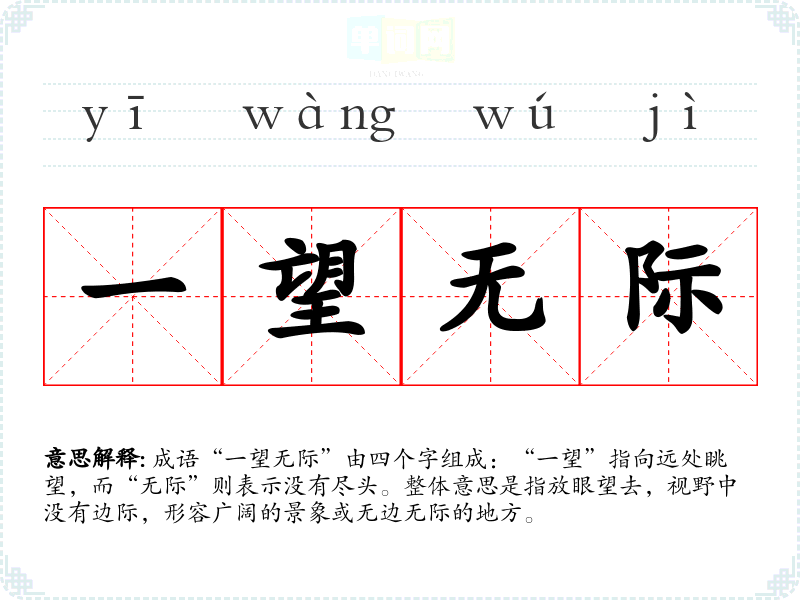 成语“一望无际”由四个字组成:“一望”指向远处眺望,而“无际”则表示没有尽头。整体意思是指放眼望去,视野中没有边际,形容广阔的景象或无边无际的地方。