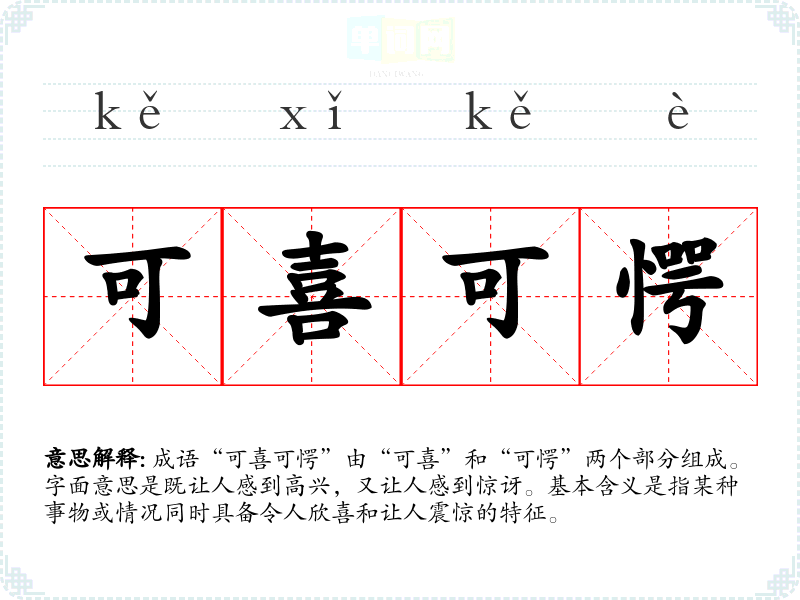 成语“可喜可愕”由“可喜”和“可愕”两个部分组成。字面意思是既让人感到高兴,又让人感到惊讶。基本含义是指某种事物或情况同时具备令人欣喜和让人震惊的特征。