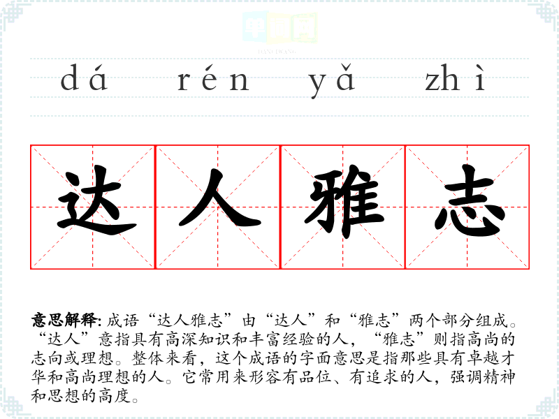 成语“达人雅志”由“达人”和“雅志”两个部分组成。“达人”意指具有高深知识和丰富经验的人,“雅志”则指高尚的志向或理想。整体来看,这个成语的字面意思是指那些具有卓越才华和高尚理想的人。它常用来形容有品位、有追求的人,强调精神和思想的高度。