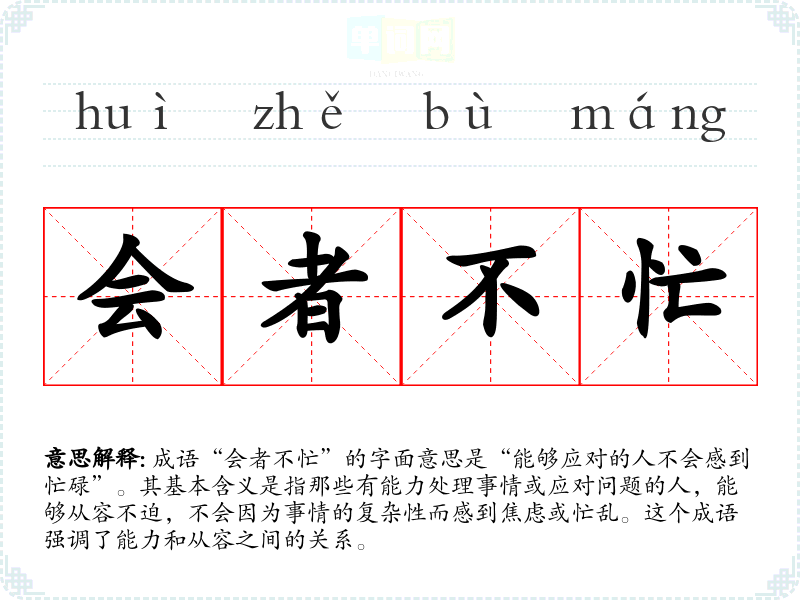 成语“会者不忙”的字面意思是“能够应对的人不会感到忙碌”。其基本含义是指那些有能力处理事情或应对问题的人,能够从容不迫,不会因为事情的复杂性而感到焦虑或忙乱。这个成语强调了能力和从容之间的关系。