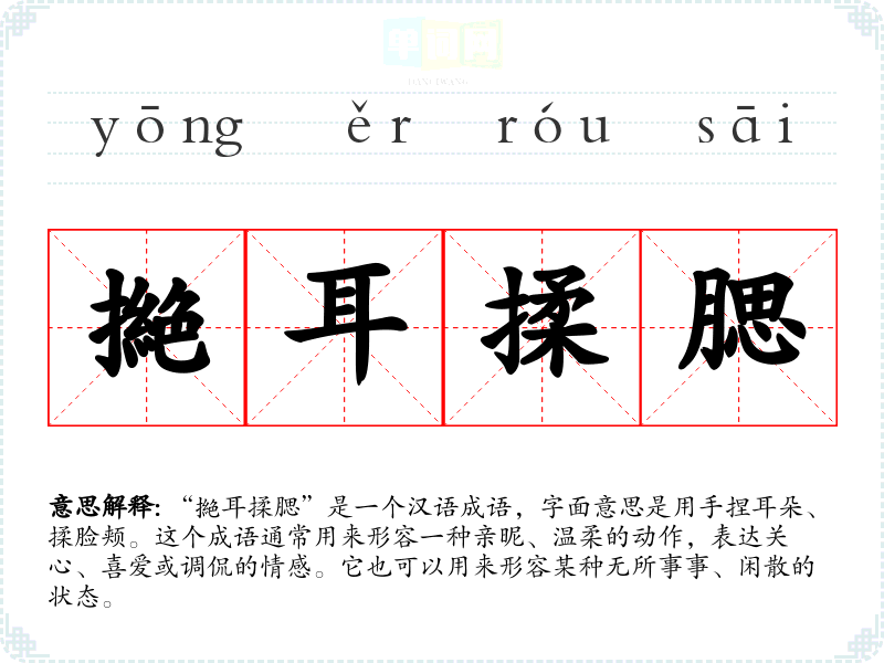 “撧耳揉腮”是一个汉语成语,字面意思是用手捏耳朵、揉脸颊。这个成语通常用来形容一种亲昵、温柔的动作,表达关心、喜爱或调侃的情感。它也可以用来形容某种无所事事、闲散的状态。