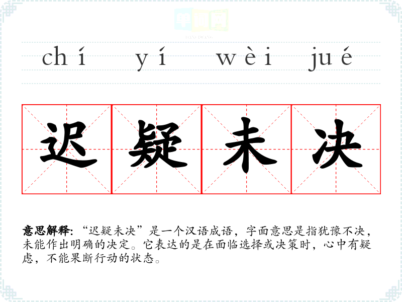 “迟疑未决”并没有明确的历史典故或文献出处,但它的构成词汇在古代文献中多次出现,反映了人们在面对复杂情况时的心理状态。成语中的“迟疑”强调了思考的慢速和不果断,而“未决”则直接说明了尚未作出决定的状态。