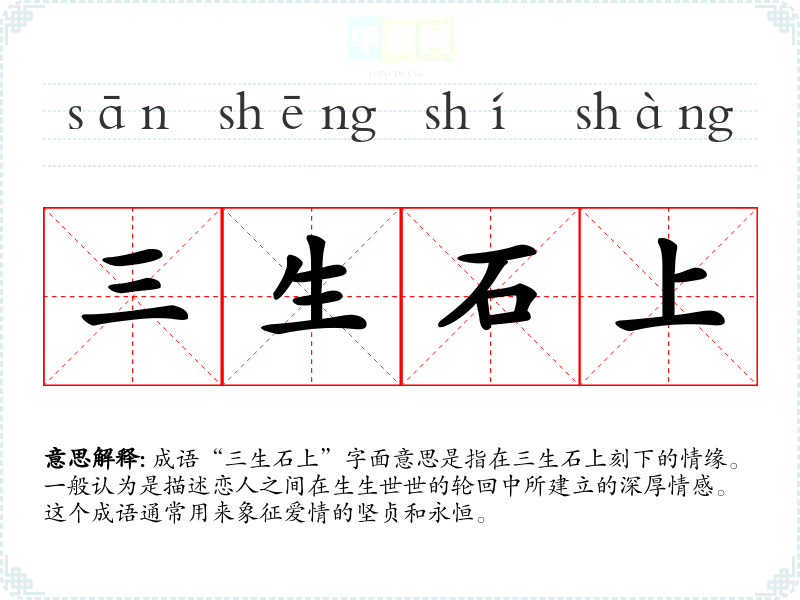 成语“三生石上”字面意思是指在三生石上刻下的情缘。一般认为是描述恋人之间在生生世世的轮回中所建立的深厚情感。这个成语通常用来象征爱情的坚贞和永恒。