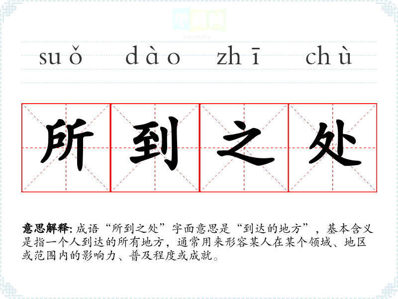 成语“所到之处”字面意思是“到达的地方”,基本含义是指一个人到达的所有地方,通常用来形容某人在某个领域、地区或范围内的影响力、普及程度或成就。