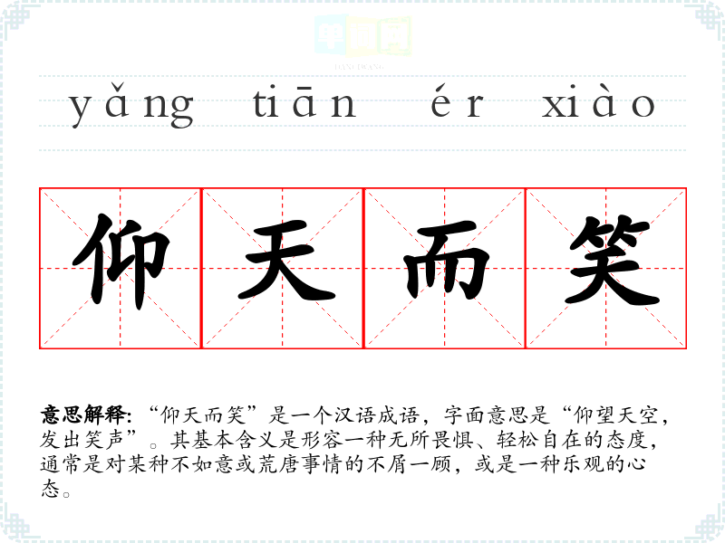“仰天而笑”是一个汉语成语,字面意思是“仰望天空,发出笑声”。其基本含义是形容一种无所畏惧、轻松自在的态度,通常是对某种不如意或荒唐事情的不屑一顾,或是一种乐观的心态。