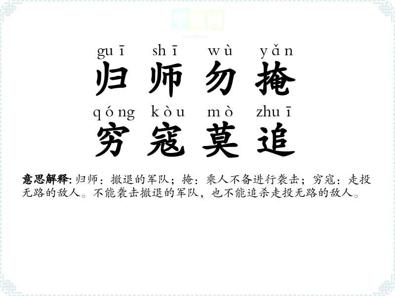 | 归师勿掩,穷寇莫追 | 归师:撤退的军队;掩:乘人不备进行袭击;穷寇:走投无路的敌人。不能袭击撤退的军队,也不能追杀走投无路的敌人。 |