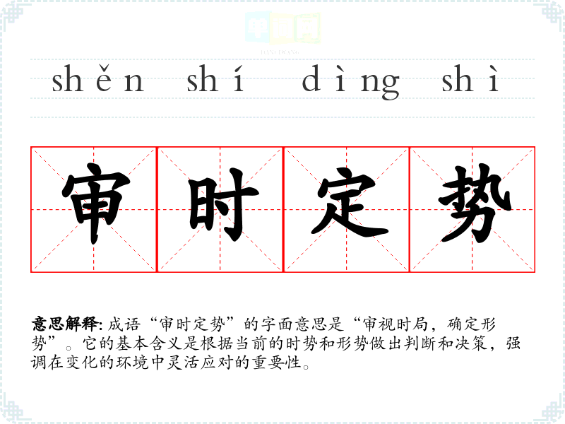 成语“审时定势”的字面意思是“审视时局,确定形势”。它的基本含义是根据当前的时势和形势做出判断和决策,强调在变化的环境中灵活应对的重要性。