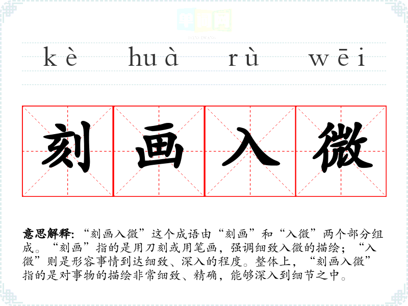 “刻画入微”这个成语由“刻画”和“入微”两个部分组成。“刻画”指的是用刀刻或用笔画,强调细致入微的描绘;“入微”则是形容事情到达细致、深入的程度。整体上,“刻画入微”指的是对事物的描绘非常细致、精确,能够深入到细节之中。