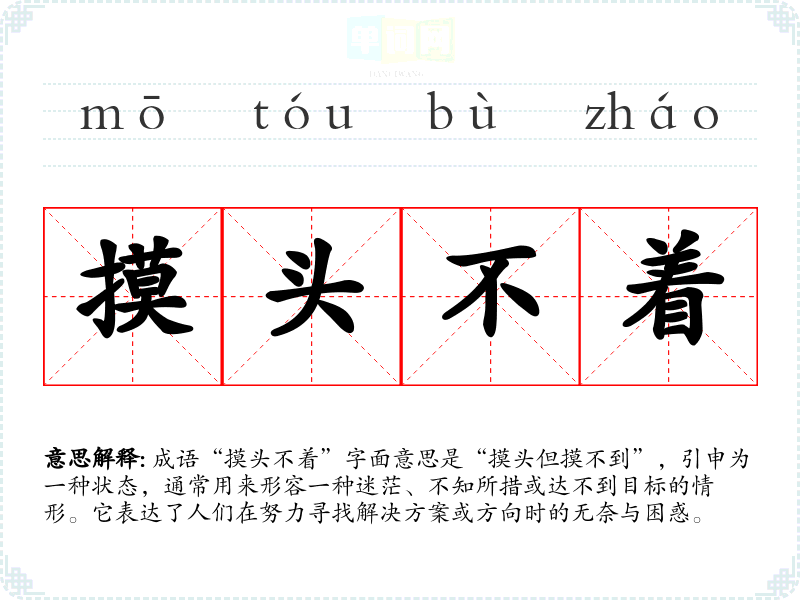 成语“摸头不着”字面意思是“摸头但摸不到”,引申为一种状态,通常用来形容一种迷茫、不知所措或达不到目标的情形。它表达了人们在努力寻找解决方案或方向时的无奈与困惑。