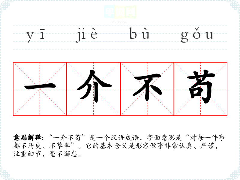 “一介不苟”是一个汉语成语,字面意思是“对每一件事都不马虎、不草率”。它的基本含义是形容做事非常认真、严谨,注重细节,毫不懈怠。