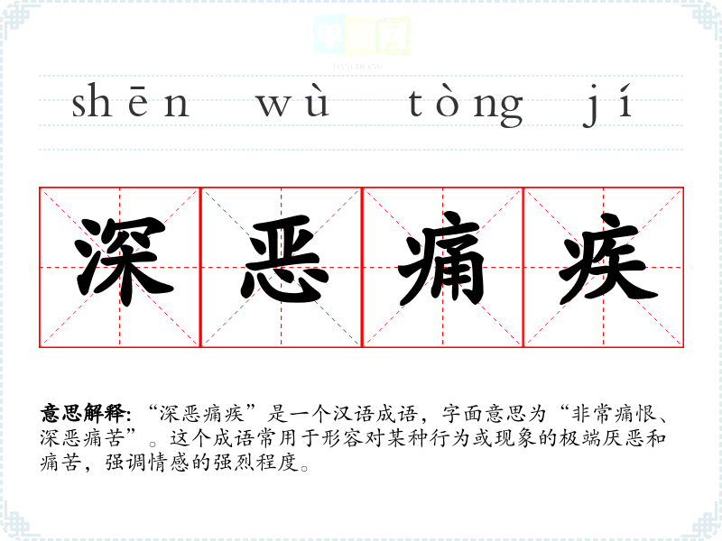 “深恶痛疾”是一个汉语成语,字面意思为“非常痛恨、深恶痛苦”。这个成语常用于形容对某种行为或现象的极端厌恶和痛苦,强调情感的强烈程度。