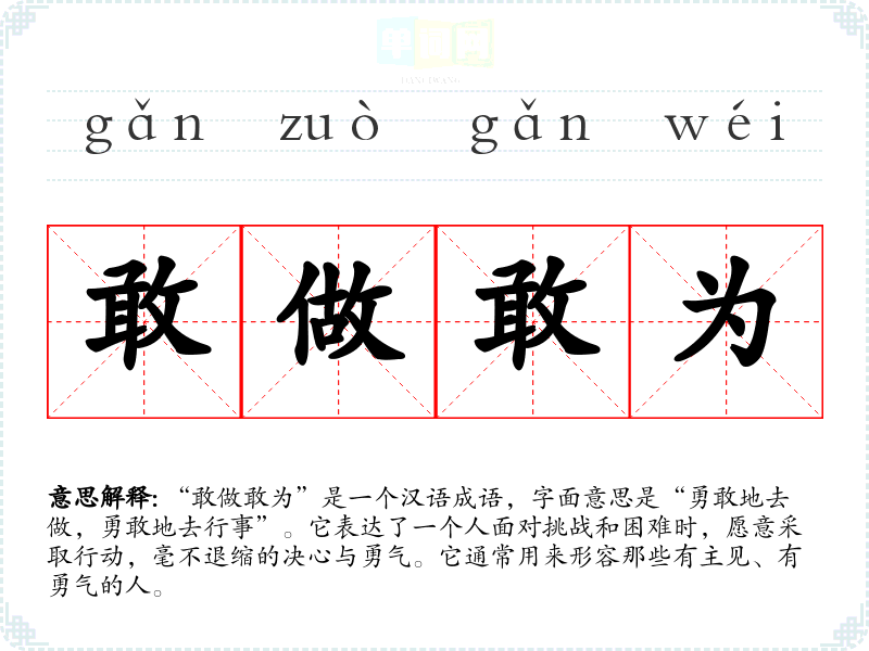 “敢做敢为”是一个汉语成语,字面意思是“勇敢地去做,勇敢地去行事”。它表达了一个人面对挑战和困难时,愿意采取行动,毫不退缩的决心与勇气。它通常用来形容那些有主见、有勇气的人。