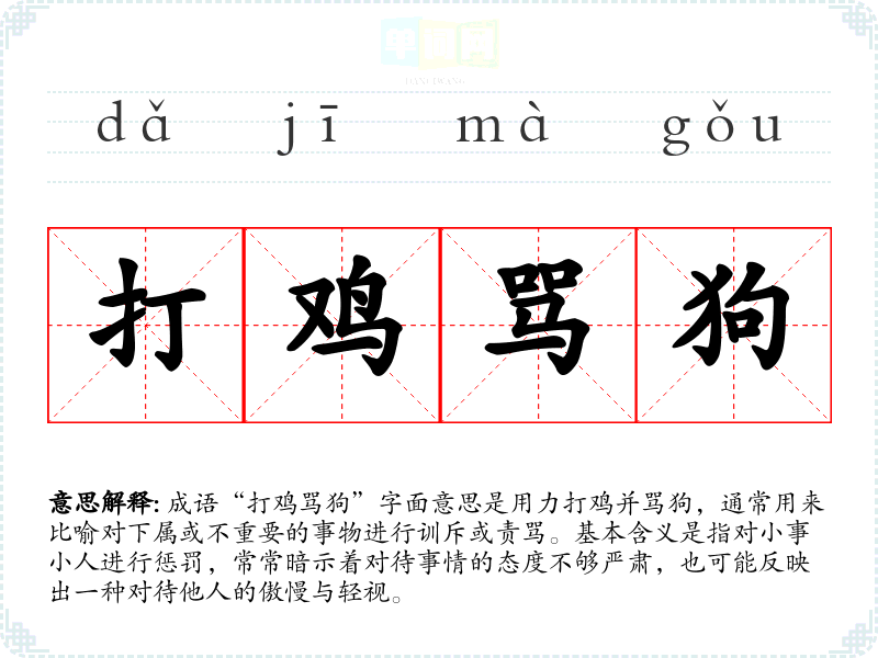 成语“打鸡骂狗”字面意思是用力打鸡并骂狗,通常用来比喻对下属或不重要的事物进行训斥或责骂。基本含义是指对小事小人进行惩罚,常常暗示着对待事情的态度不够严肃,也可能反映出一种对待他人的傲慢与轻视。