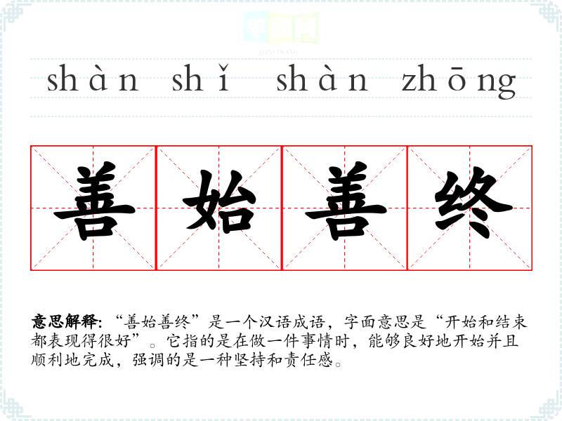 “善始善终”是一个汉语成语,字面意思是“开始和结束都表现得很好”。它指的是在做一件事情时,能够良好地开始并且顺利地完成,强调的是一种坚持和责任感。