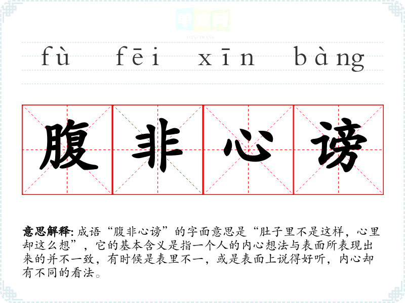 成语“腹非心谤”的字面意思是“肚子里不是这样,心里却这么想”,它的基本含义是指一个人的内心想法与表面所表现出来的并不一致,有时候是表里不一,或是表面上说得好听,内心却有不同的看法。