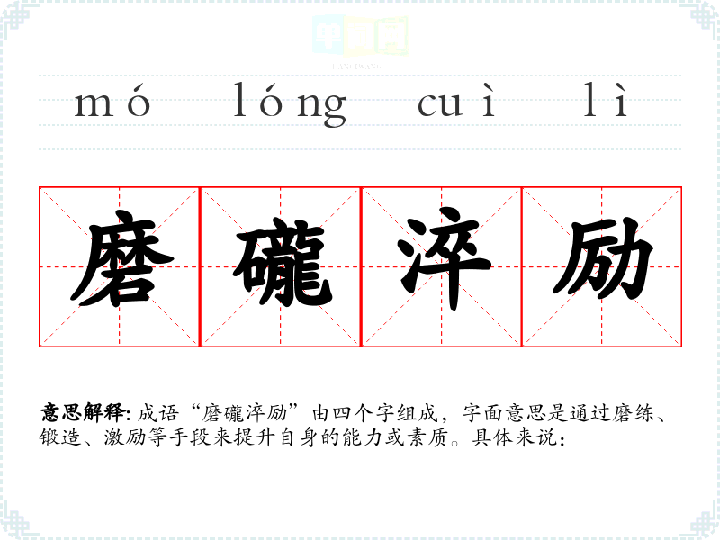 - 磨:磨练、磨砺,意味着通过实践和挑战来提高。
