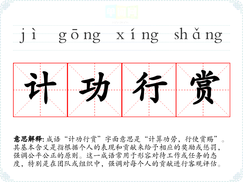 成语“计功行赏”字面意思是“计算功劳,行使赏赐”。其基本含义是指根据个人的表现和贡献来给予相应的奖励或惩罚,强调公平公正的原则。这一成语常用于形容对待工作或任务的态度,特别是在团队或组织中,强调对每个人的贡献进行客观评估。