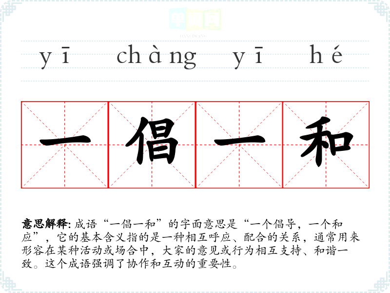 成语“一倡一和”的字面意思是“一个倡导,一个和应”,它的基本含义指的是一种相互呼应、配合的关系,通常用来形容在某种活动或场合中,大家的意见或行为相互支持、和谐一致。这个成语强调了协作和互动的重要性。