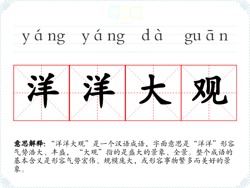 “洋洋大观”是一个汉语成语,字面意思是“洋洋”形容气势浩大、丰盛, “大观”指的是盛大的景象、全景。整个成语的基本含义是形容气势宏伟、规模庞大,或形容事物繁多而美好的景象。