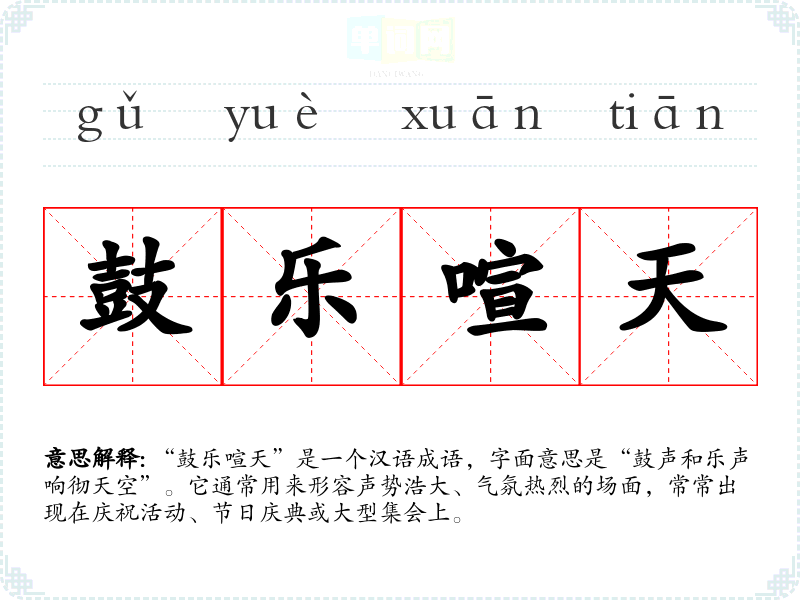 “鼓乐喧天”是一个汉语成语,字面意思是“鼓声和乐声响彻天空”。它通常用来形容声势浩大、气氛热烈的场面,常常出现在庆祝活动、节日庆典或大型**上。