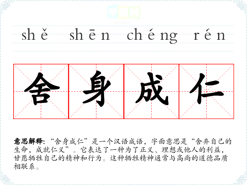 “舍身成仁”是一个汉语成语,字面意思是“舍弃自己的生命,成就仁义”。它表达了一种为了正义、理想或他人的利益,甘愿牺牲自己的精神和行为。这种牺牲精神通常与高尚的道德品质相联系。