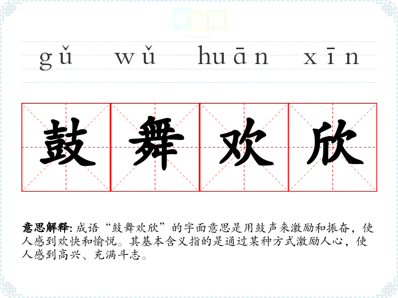成语“鼓舞欢欣”的字面意思是用鼓声来激励和振奋,使人感到欢快和愉悦。其基本含义指的是通过某种方式激励人心,使人感到高兴、充满斗志。