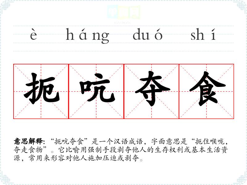 “扼吭夺食”是一个汉语成语,字面意思是“扼住喉咙,夺走食物”。它比喻用强制手段剥夺他人的生存权利或基本生活资源,常用来形容对他人施加压迫或剥夺。