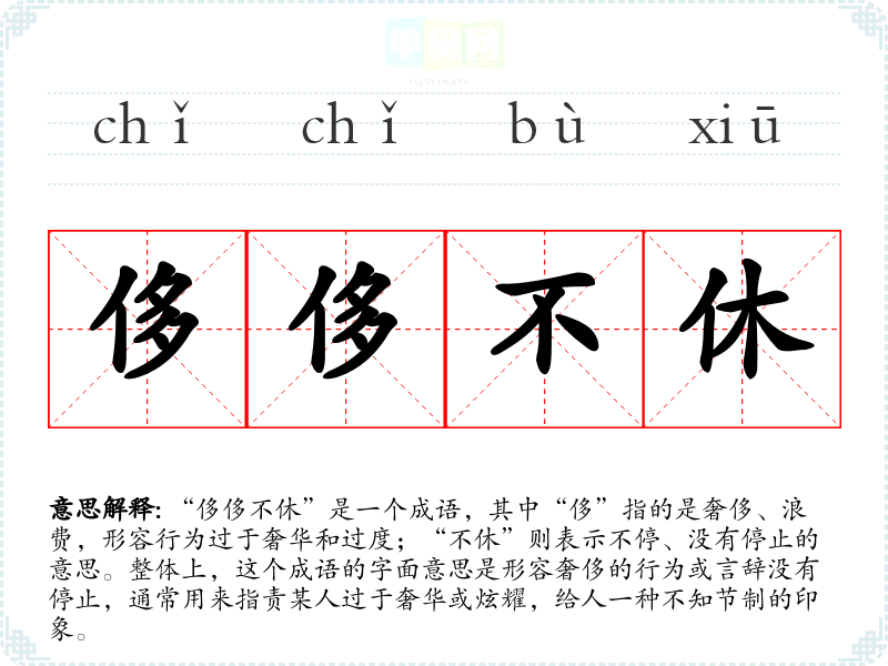 “侈侈不休”是一个成语,其中“侈”指的是奢侈、浪费,形容行为过于奢华和过度;“不休”则表示不停、没有停止的意思。整体上,这个成语的字面意思是形容奢侈的行为或言辞没有停止,通常用来指责某人过于奢华或炫耀,给人一种不知节制的印象。